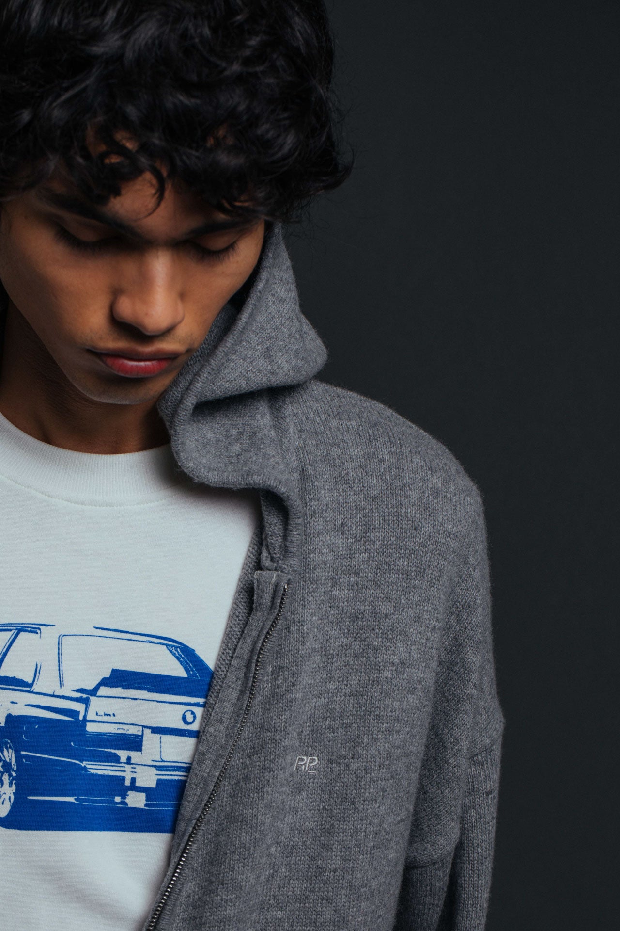 Slouchy in nature for comfort and fit. A grey marl knit with custom branding details and a dual zip.